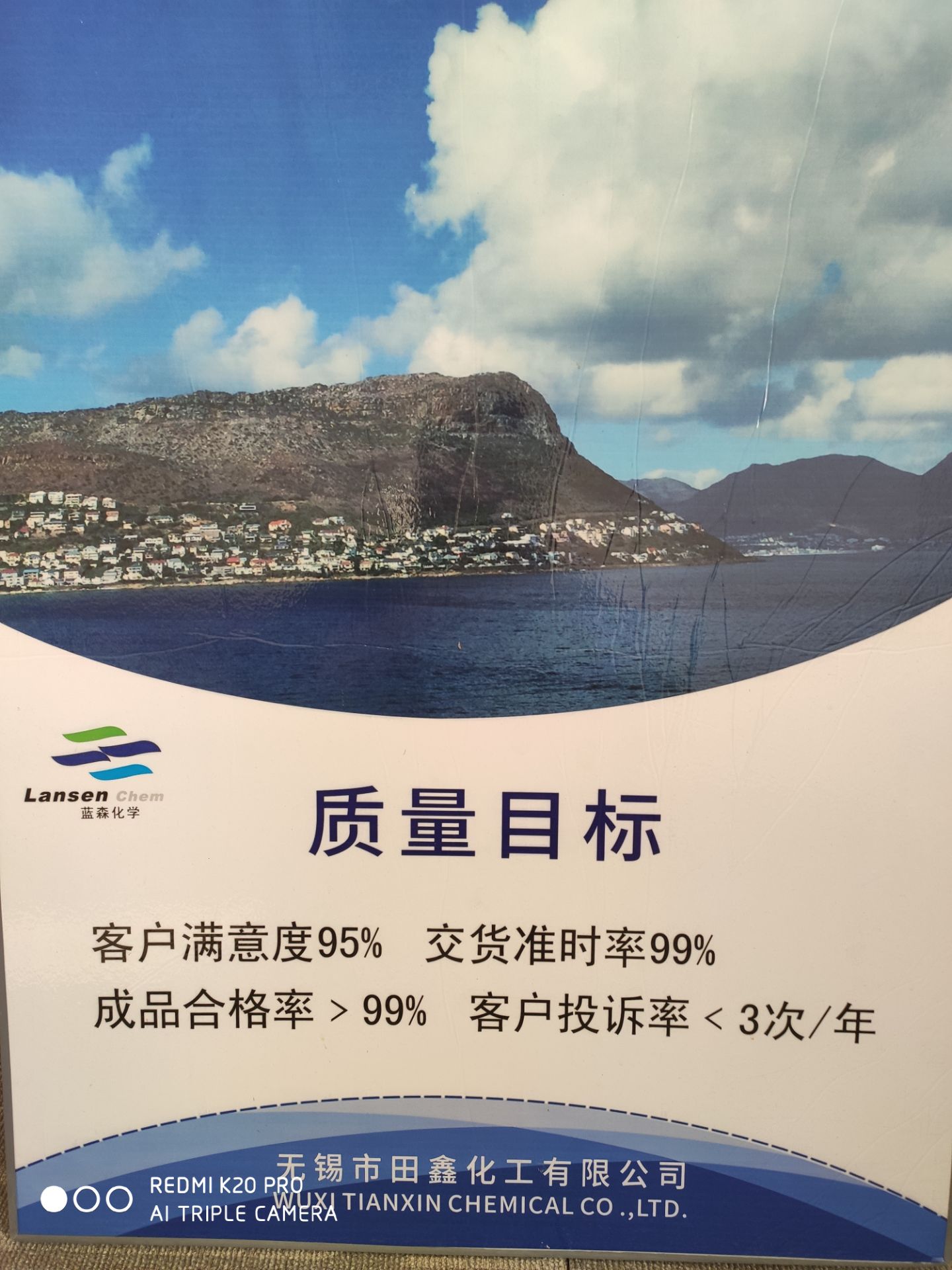 無(wú)錫市田鑫化工有限公司主要產(chǎn)品包括脫色絮凝劑、聚二甲基二烯丙基氯化銨、聚胺、聚丙烯酰胺乳液,聚合氯化鋁,造紙固著劑、助留助濾劑、涂布助劑(抗水劑,潤(rùn)滑劑), 印染無(wú)醛固色劑等。無(wú)錫市田鑫化工有限公司通過ISO9001質(zhì)量管理體系認(rèn)證和14001環(huán)境管理,45001職業(yè)健康安全管理體系認(rèn)證。