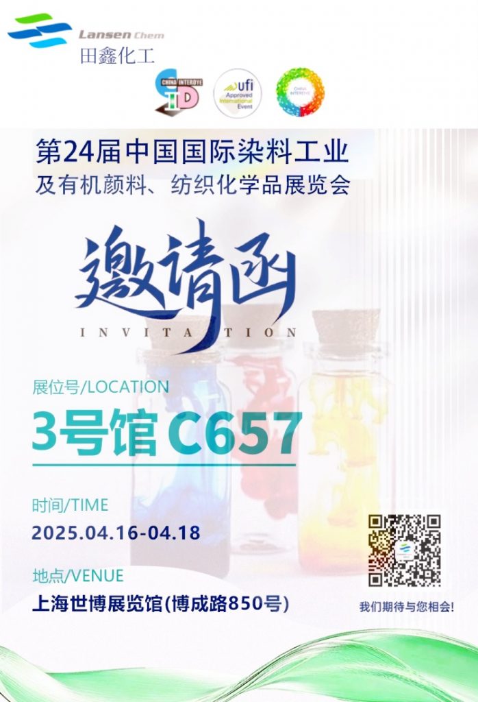 全球染化行業(yè)標(biāo)桿盛會(huì)——第二十四屆中國(guó)國(guó)際染料工業(yè)及有機(jī)顏料、紡織化學(xué)品展覽會(huì)(CHINA INTERDYE 2025)將于2025年4月16-18日在上海世博展覽館舉辦。本屆展會(huì)展品涵蓋各類(lèi)先進(jìn)的環(huán)保型染料、有機(jī)顏料、助劑、中間體、儀器環(huán)保設(shè)備、配套服務(wù)等。無(wú)錫市田鑫化工將攜紡織印染助劑等產(chǎn)品參展!