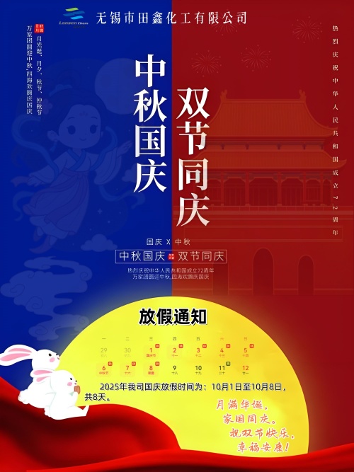 您好!國慶中秋雙節(jié)將至,田鑫化工放假時(shí)間安排如下: