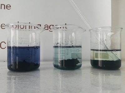 試驗(yàn)過程:取原水50ML→依次加入一毫升脫色劑、PAC、PAM→攪拌→絮凝沉淀→靜置脫色