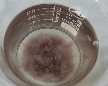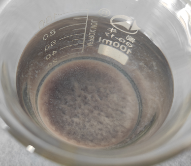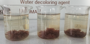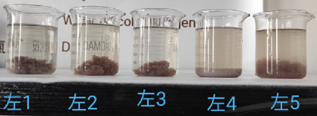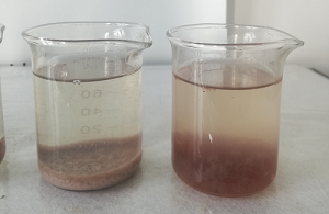 礬花沉降對比:左一為客戶寄來藥劑沉降效果 (礬花小且沉降不干凈、水渾濁) 右一為我司脫色劑礬花沉降(礬花大且沉降干凈、水質清澈)