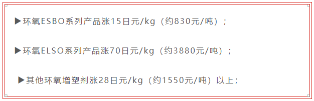 而就在幾天前的1月31日,全球著名的化學(xué)產(chǎn)品生產(chǎn)企業(yè)DIC株式會社發(fā)布漲價通知,稱從2月10日的交貨期起,上調(diào)環(huán)氧系增塑劑的價格。具體漲幅如下: